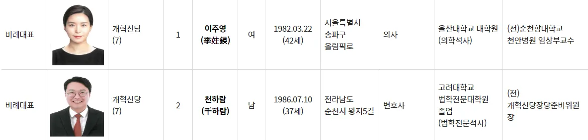 2번: 천하람: 변호사로 활동하며 고려대학교 법학전문대학원에서 법학 전문 석사 학위를 취득. 법률 분야의 전문 지식과 정치 활동 경험으로 법률 개정 및 정치적 혁신에 기여할 수 있음.