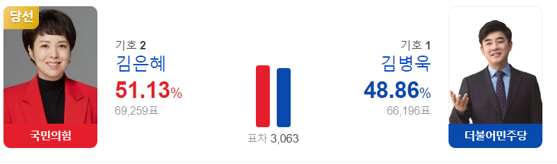 개표 결과, 국민의힘 김은혜후보가 51.13%의 득표율을 얻어 당선되었습니다.