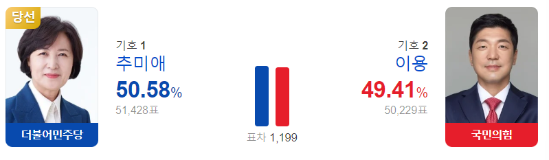 윤대통령 호위 무사로 불리던 국민의힘 이용 후보는 49.41%의 득표율을 얻었고 1199표 차이로 낙선하였습니다.