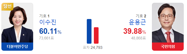국민의힘 윤용근 후보는 39.88%를 얻었고 이수진 후보와의 표 차이는 24793표로 낙선하였습니다.