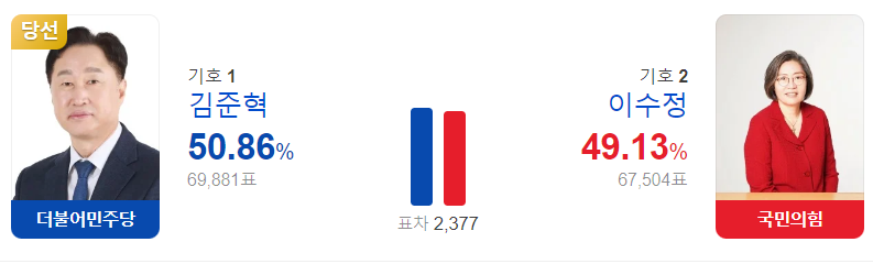 경기도 수원정 선거구도 여론조사에서 경합을 벌였던 곳인데요. 개표 결과 더불어민주당 김준혁 후보가 당선되었습니다. 50.86%의 득표율을 얻었습니다.