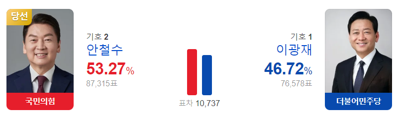 하지만 최종 개표 결과, 국민의힘 안철수 후보가 53.27%의 득표율을 얻어 국회의원에 당선되었습니다.