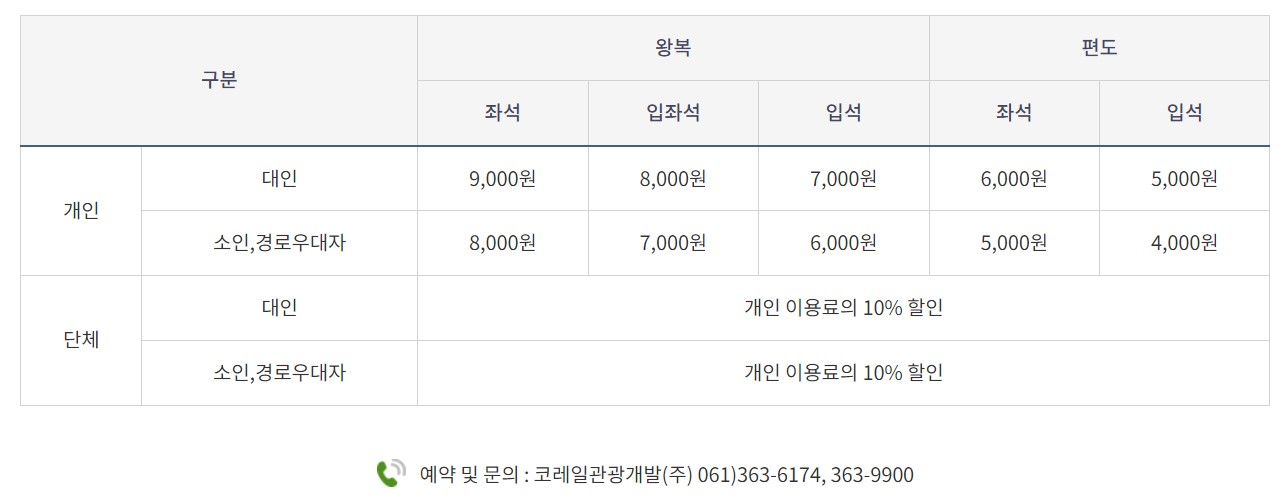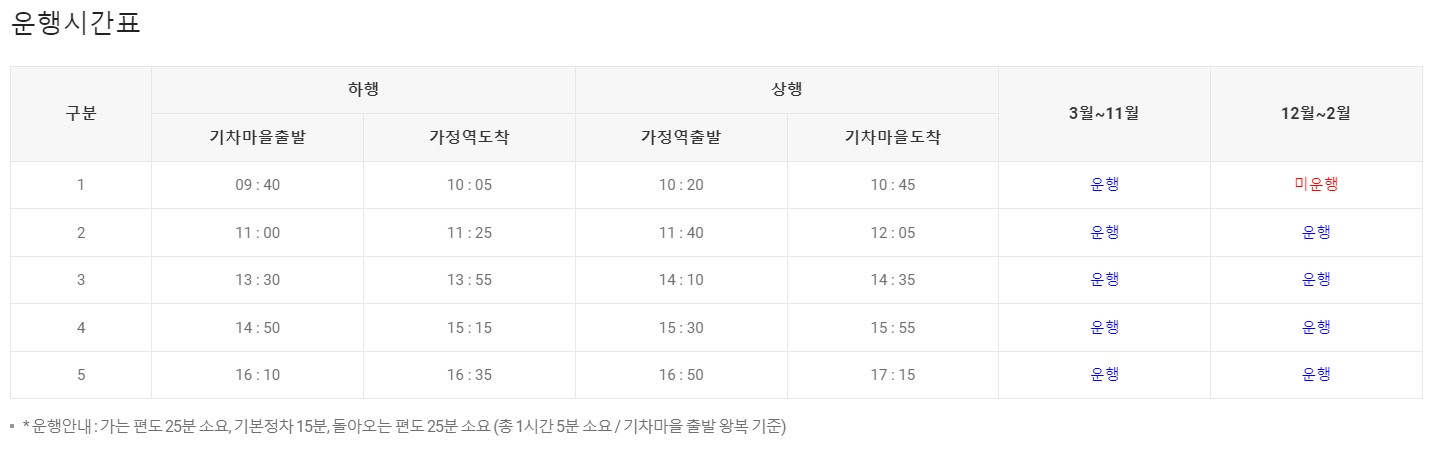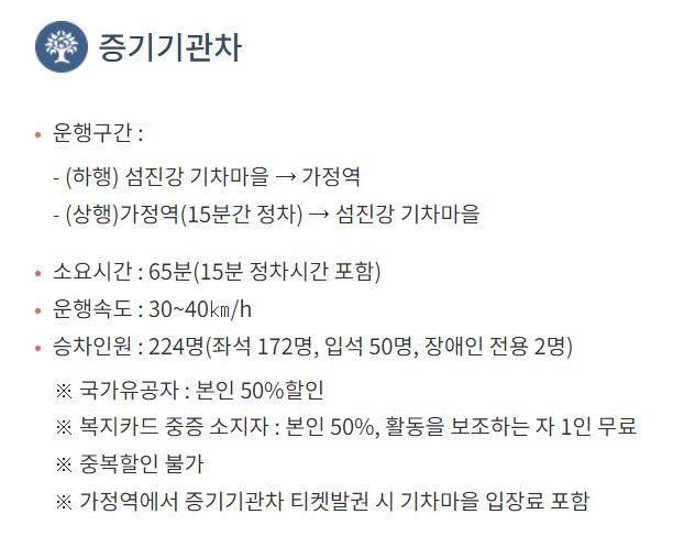 운행구간은 섬진강 기차마을-가정역 (하행), 가정역- 섬진강 기차마을(상행)이며 가정역에서 15분간 정차합니다. 소요시간은 65분(가정역 15분 정차시간 포함)이며 승차인원은 224명이며 좌석 172석, 입석 50석, 장애인 전용 2석이 마련되어 있습니다. 요금은 대인 왕복 좌석은 9000원, 대인 편도 좌석은 6000원입니다. 할인 혜택은 상기 이미지를 확인하시기 바랍니다.
