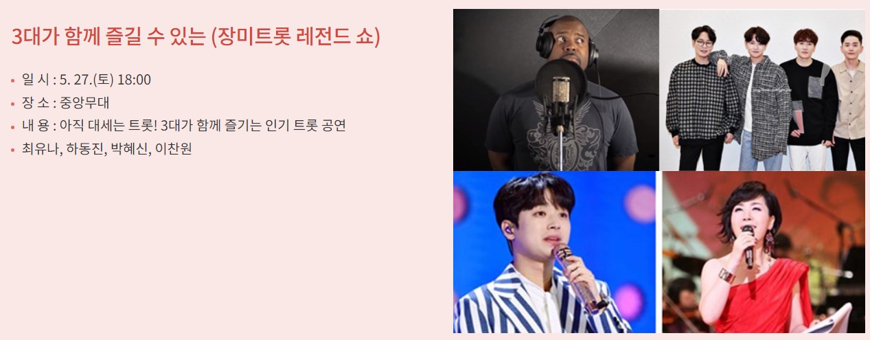 개막식인 5월 20일에는 백지영, 5월 21일에는 바다, 그 다음주 5월 27일에 드디어 이찬원이 출연합니다.
