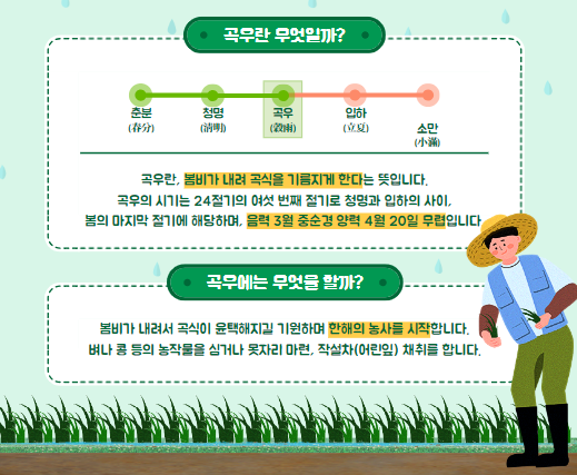 곡우는 본격적인 농사철의 시작을 알리는 신호로, 농민들에게는 물 관리, 논밭 관리, 잡초 제거와 같은 다양한 농작업을 시작하는 중요한 시간입니다.