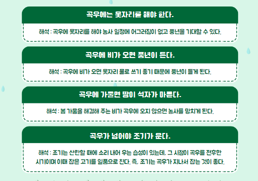 이 속담은 경기 포천 지역에서 유래된 것으로, 곡우 때 가뭄이 들면 농사에 큰 피해가 오고 결국 흉년이 찾아온다는 의미를 담고 있습니다. 이는 곡우 시기의 비가 얼마나 농작물 성장에 중요한지를 강조하는 말이에요.