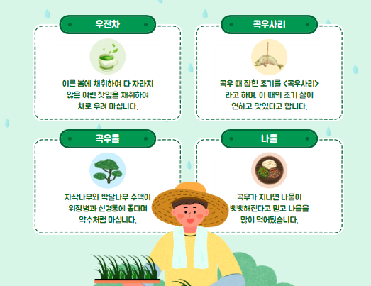 산란할 때 소리를 내어 우는 습성이 있는 조기를 곡우철조기, 곡우살조기, 오사리조기라고 부릅니다. 또한, 우전차(雨前茶)라는 특별한 차도 이때 만들어집니다. 이 차는 곡우에 첫 비가 내리기 전에 따는 찻잎으로 만들어지며, 봄의 도래를 알리는 상징적인 음료로 여겨져요.