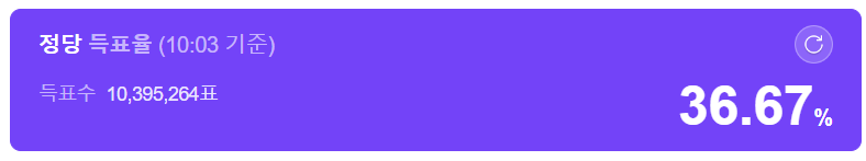 현재 전국 비례대표 개표율은 99.97%인데요. 4월 11일 10시 기준으로, 국민의미래는 10,395,264표를 득표했고 36.67%의 득표율을 얻었습니다.