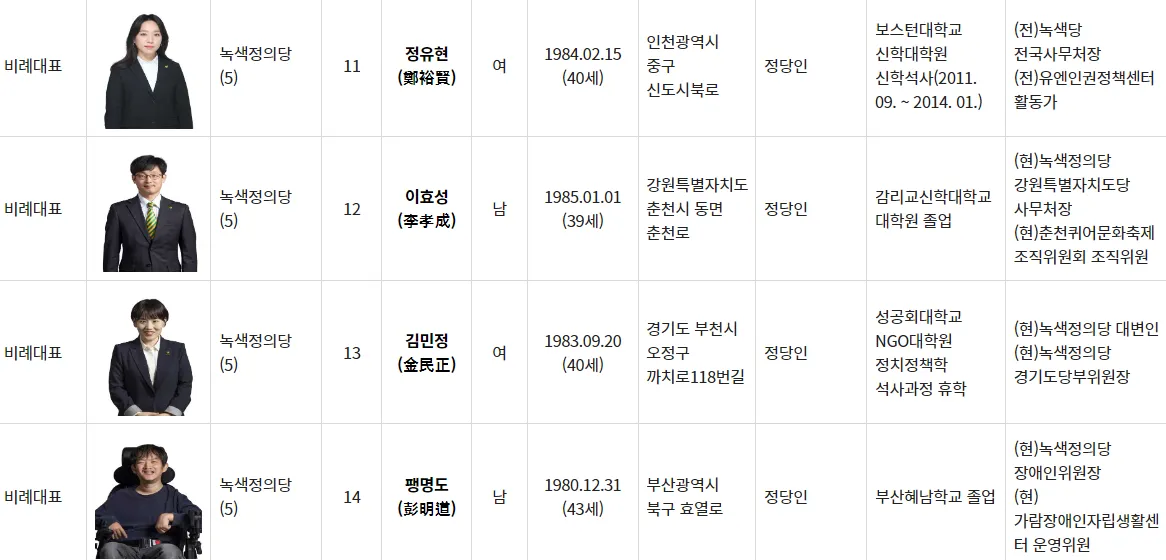 12번 이효성: 감리교신학대학교 대학원에서 졸업하였으며, 현재는 녹색정의당 강원특별자치도당 사무처장을 역임하고 있습니다.