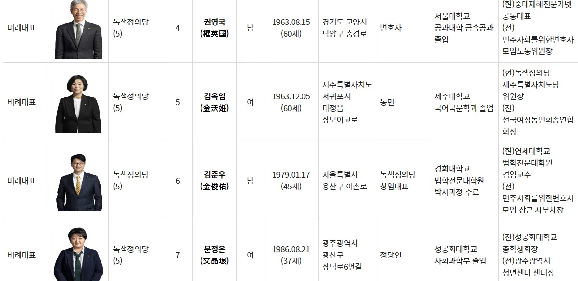 녹색정의당 비례대표 명단 순번 1~ 7번