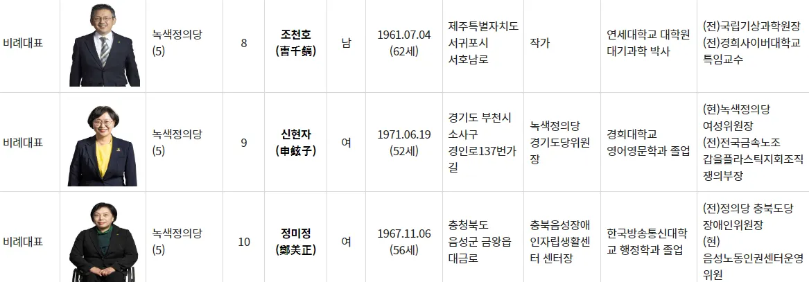10번 정미정: 한국방송통신대학교에서 행정학을 전공하였으며, 정의당 충북도당 장애인위원장을 맡은 경력이 있습니다.