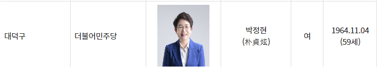 대전 대덕구 국회의원 당선자는 더불어민주당 박정현 후보입니다. 박정현 후보 또한 유성을 황정아 후보와더불어 대전 지역 첫 여성 국회의원이 되었습니다.