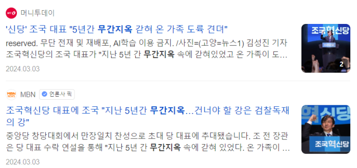 최근 기사에서는 조국 당대표는 '5년간 무간지옥 갇혀 온 가족들'과 같은 표현을 썼습니다.