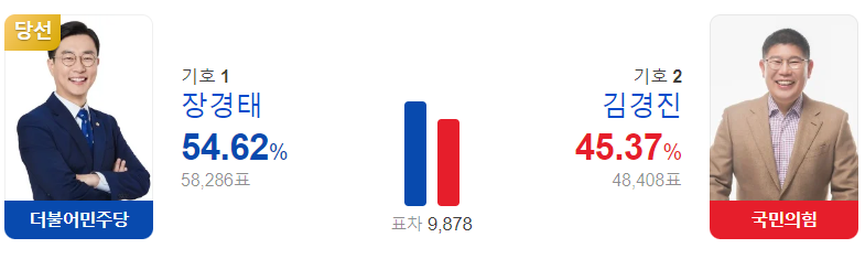 최종 투표 결과, 더불어민주당 장경태 후보가 54.62%의 득표율을 얻어 국회의원에 당선되었습니다.