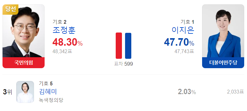 최종 투표 결과는, 국민의힘 조정훈 후보의 승리로 돌아갔습니다. 조정훈 후보는 48.30%의 득표율로, 단 599 표 차이로 당선되었습니다.