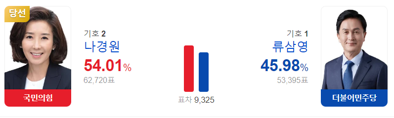 나경원은 54.01%의 득표율을 얻었고요. 민주당 류삼영 후보는 45.98%를 득표하였지만 9325표 차이로 낙선하였습니다.