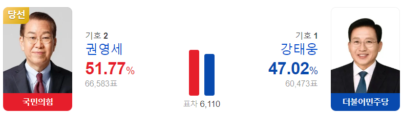 투표 결과는 국민의힘 권영세 후보가 51.77%의 득표율을 얻어 승리했습니다.