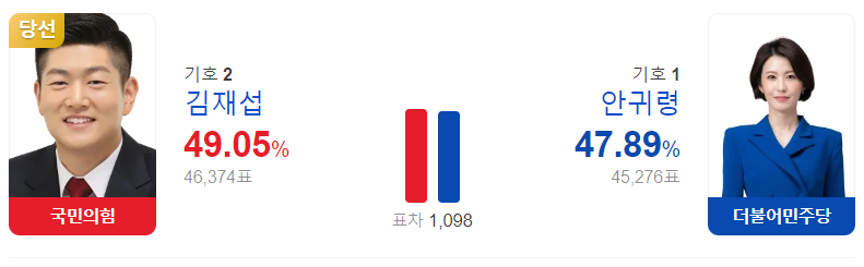 여론조사 결과에서도 민주당 안귀령 후보의 지지율이 계속 높았지만, 최종 투표 결가에서는 1098표 차이로 안귀령 후보가 낙선하고 말았습니다.