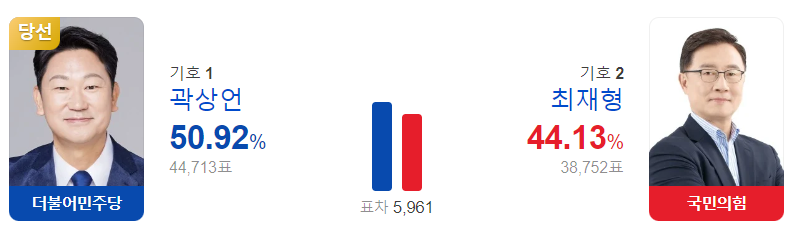 투표 결과는 더불어민주당 곽상언 후보가 50.92%의 득표율을 얻어 국회의원으로 당선되었습니다. 국민의힘 최재형 후보는 2선에 도전했지만 5961표 차이로 낙선하였습니다.