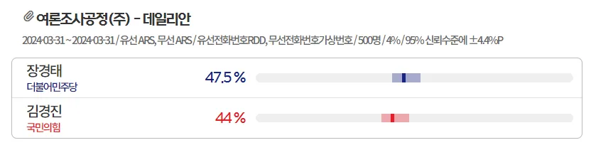 3월 31일 진행된 데일리안-여론조사공정의 여론조사에서는 장경태 47.5%, 김경진 44%로 나왔는데요. 민주당 장경태 후보가 오차범위 안인 3.5%로 앞서고 있는 것으로 나왔습니다.