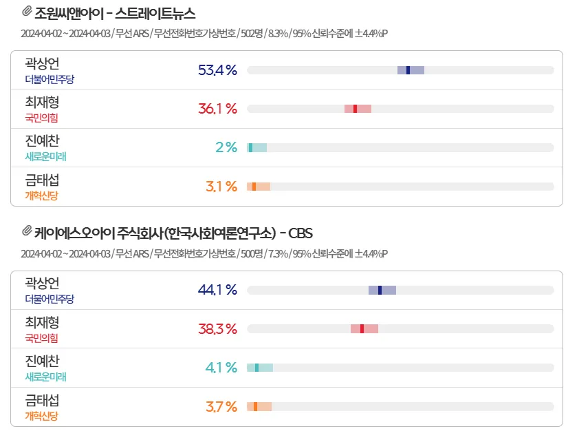 하지만 최근 진행된 여론조사를 살펴보면 격차가 벌어진 것을 알 수 있어요. 3월 31일~4월2일 진행된 sbs에 의뢰한 여론조사 결과는 곽상언 50%, 최재형 38%, 금태섭 4% 의 지지율로 나타났습니다.