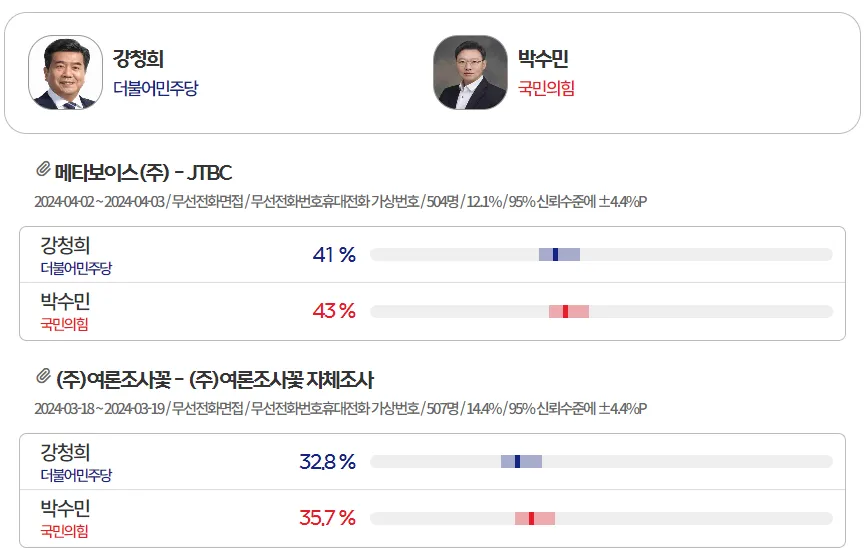 최근 진행된 여론조사에 따르면, 이번 선거에서 더불어민주당의 강청희 후보와 국민의힘의 박수민 후보 간에 경쟁이 매우 치열합니다.