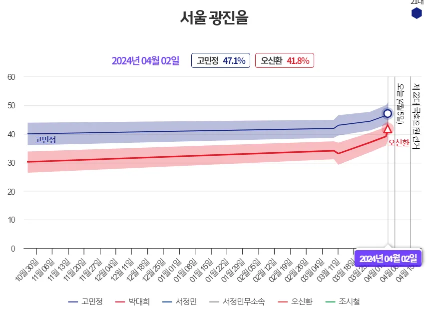 지난 3월 민주당의 고민정 후보의 지지율은 41.9%, 국민의힘 오신환 후보는 39.1%였습니다. 4월 2일 여론조사에서는 고민정 47.1%, 오신환 41.8%로 나왔고요. 오신환 후보가 간격을 좁혔습니다.