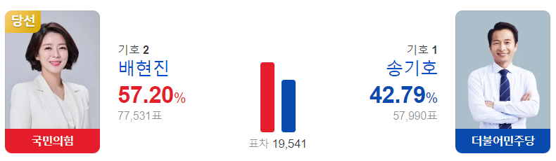국민의힘 배현진 후보는 57.20%의 득표율을 얻었고 표 차이는19541표로 더불어민주당 송기호 후보에게 약 16% 이상의 차이로 승리했습니다.