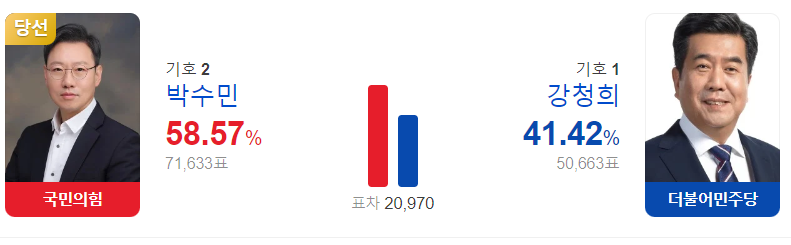 더불어민주당 강청희 후보는 41.42%의 득표율을 얻었고 20970표 차이로 낙선하였습니다.
