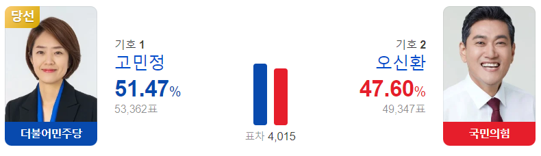 최종 개표 결과, 더불어민주당 고민정 후보가 51.47%의 득표율을 얻어 국회의원 당선자가 되었습니다.