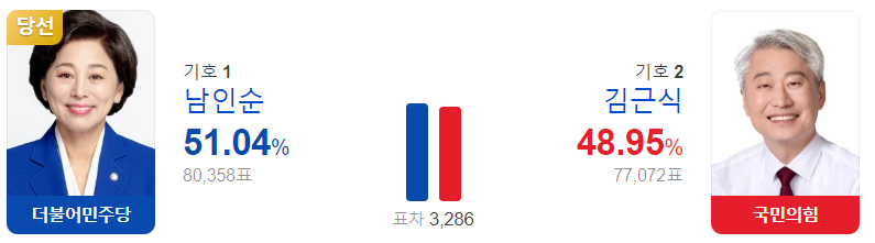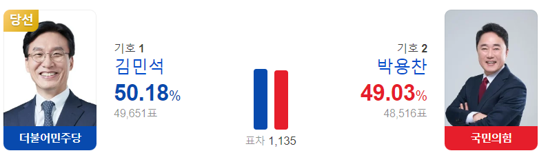 국민의힘 김근식 후보는 득표율 48.95%를 얻었고 3286표 차이로 낙선했습니다.
