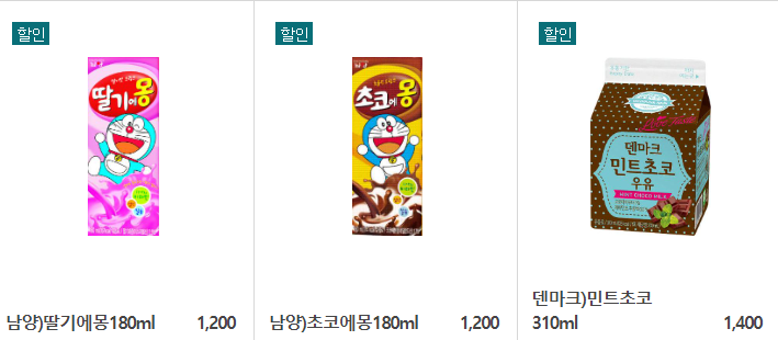 증정행사 상품도 있는데요. 엄마손파이를 사면 롯데미니딸기샌드를 증정하는 행사입니다. 초코에몽과 딸기에몽은 1200원으로 할인하여 판매하고 있습니다.