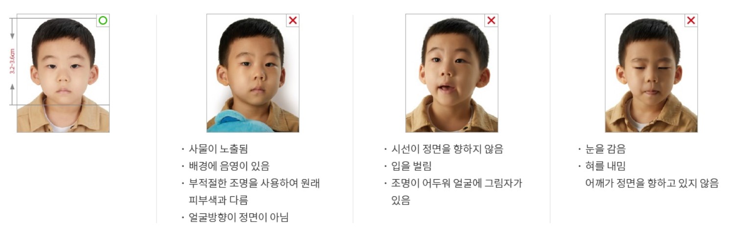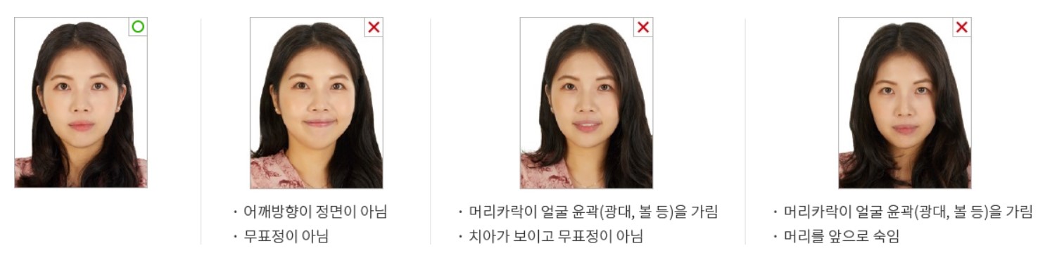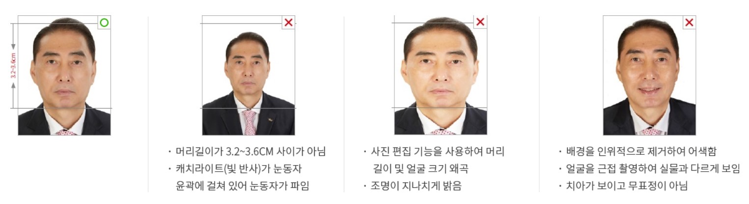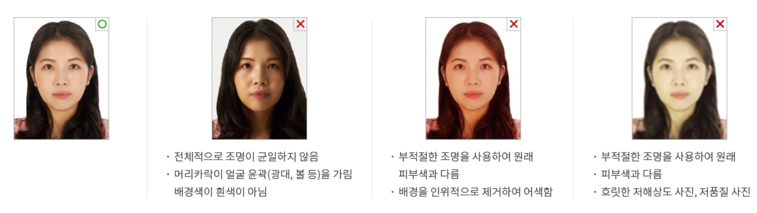 - 본인이 직접 찍은 사진은 여권사진 규격에 적합한 경우에만 사용 가능합니다.
