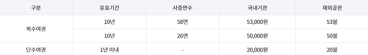 10년 유효기간의 복수여권 26면은 50,000원이며 58면은 53,000원입니다.