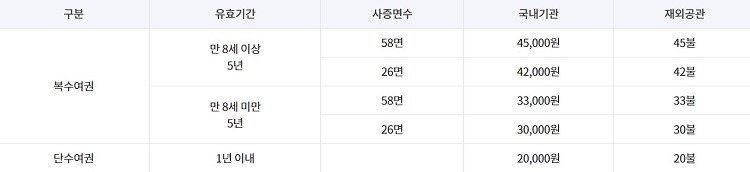 단수여권은 1회만 사용가능한 여권이며 20,000원입니다. 5년 복수여권 26면은 42,000원이며 56면은 45,000원입니다.