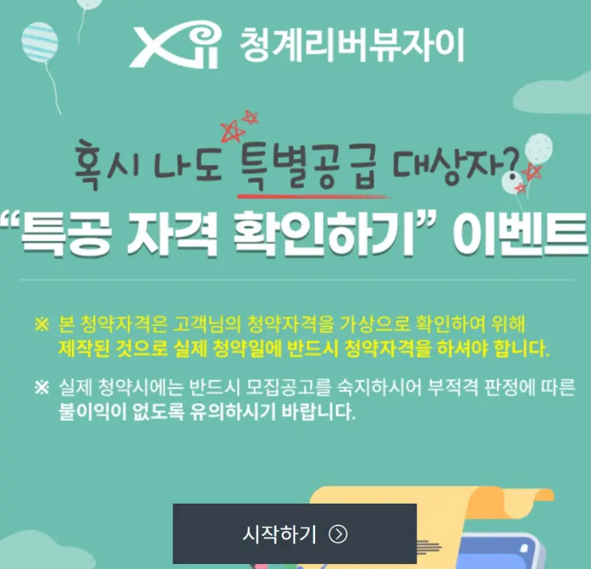 특별공급 자격이 되는지 궁금하시죠? 청계 리버뷰자이에서 특공 자격 확인하는 시스템을 마련했고 이 시스템을 이용하여 특공 자격 확인하는 분들을 대상으로 이벤트도 진행하고 있다고 해요.