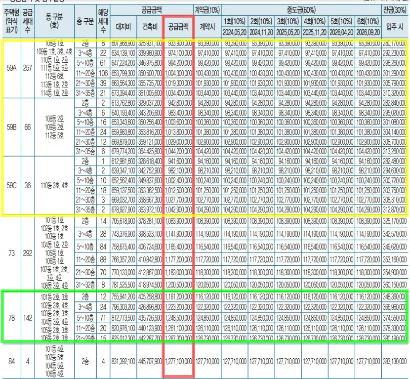 | 59C | 9억 4160 만원 ~ 10억 4290 만원 |