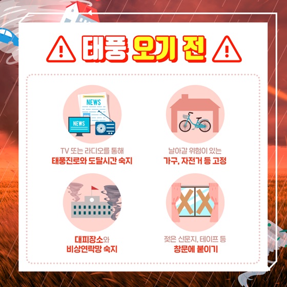 - TV, 라디오, 인터넷, 스마트폰 등으로 기상 상황을 미리 파악하여 태풍 대비 준비를 합니다.