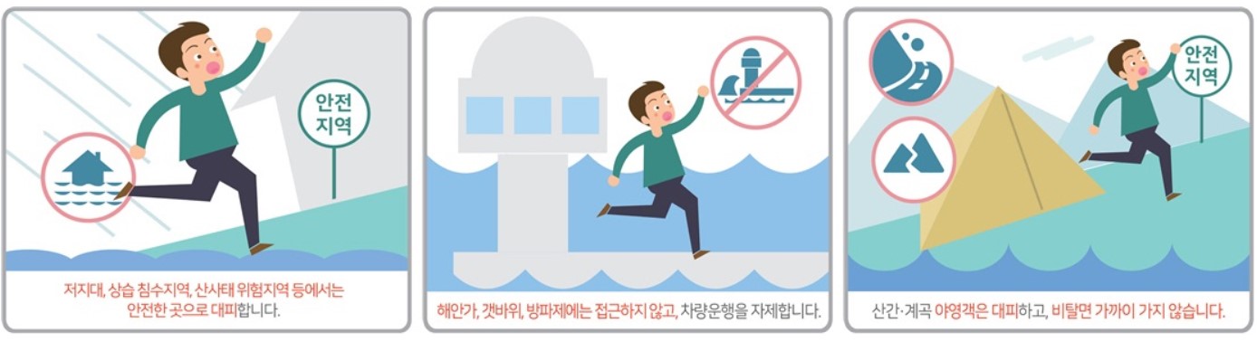 - 저지대나 상습 침수지역, 산사태 위험지역, 지하 공간이나 붕괴 우려가 있는 노후 주택이나 건물 등에서는 주변 사람들에게 알려주고 안전한 곳으로 이동합니다.