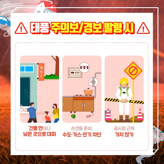 - 태풍 주의보나 태풍 경보 발효 시에 논이나 밖에 나가지 않기