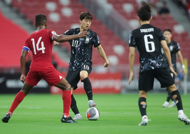 한국 싱가포르 경기에서 출전한 선수는 골키퍼 조현우, 김진수, 권경원, 조유민, 황재원, 정우영, 황인범, 이재성, 이강인, 손흥민, 주민규 선수고요. 후반에 교체되어 출전한 선수는 박승욱, 배준호, 엄원상, 오세훈, 황희찬 선수였습니다.