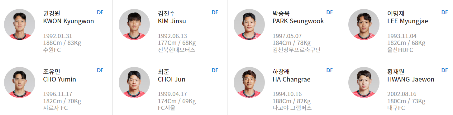- DF - 권경원(수원FC) - 박승욱(김천상무) - 조유민(샤르자) - 하창래(나고야) - 김진수(전북현대) - 이명재(울산HD) - 황재원(대구FC) - 최준(FC서울)