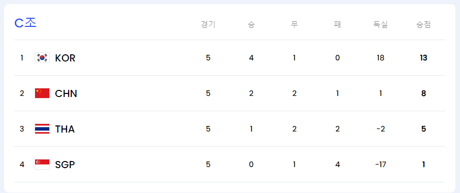 대한민국은 중국, 태국, 싱가포르와 함께 C조에 속해 있습니다. 현재 조별 순위에서 대한민국은 1위를 하고 있습니다.