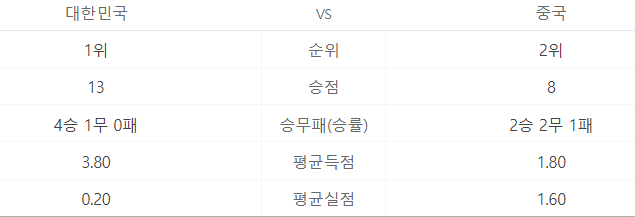 한국은 중국과의 전체 역대 전적에서 22승 13무 2패의 기록으로 앞서고 있습니다. 한국은 FIFA 랭킹 23위, 중국은 88위로 큰 차이가 있습니다. 최근에 치렀던 5경기 상대 전적도 4승 1패로 우리가 크게 앞서 있습니다.