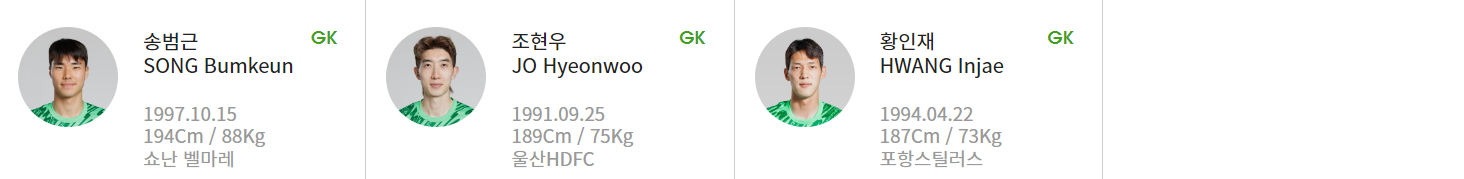 - GK - 조현우(울산HD) - 송범근(쇼난 벨마레) - 황인재(포항스틸러스)