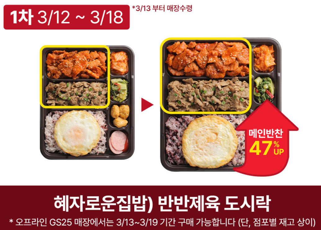 연기자 김혜자님을 모델로 한 혜자 도시락 챌린지 이벤트를 2월 27일부터 4월 9일까지 진행하는데요. 사전예약을 통해 메인반찬 47% + 흑미밥 15% UP해주고 가격은 그대로 인 제품을 판매합니다. 2월 27일 사전예약상품은 1시간만에 완판을 했대요.